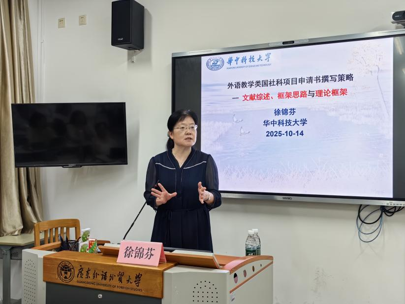 2025年10月14日晚,英语教育学院在大学城校区教学楼F305教室成功举办“外语教学类项目申请书撰写策略”专题讲座,本场讲座特邀华中科技大学二级教授、博士生导师徐锦芬教授主讲。英语教育学院院长吴岩教授、英语师范系秦丽莉教授、2026年高层次项目申报人及2024级、2025级研究生到现场参加讲座。本场讲座由英语教育学院副院长李惠胤教授主持。