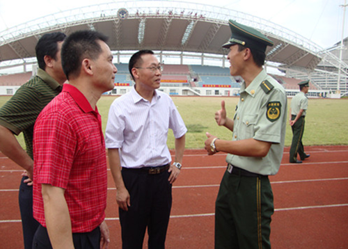 入学至今,新生们为期三个星期的军训已经接近尾声,即将在本周星期四的军训汇演大会上画上一个完美的句号。26日上午,我院党委书记林绍雄、副院长董金伟、党委副书记何伟儒以及辅导员姜尖、辅导员助理郑嘉伟亲自到达广外真草场体育场对我院2012级新生们进行军训慰问。