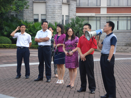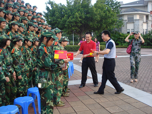 2014年9月22日星期一下午5:00,英语教育学院2014级学子身穿绿色迷彩服齐聚院系楼前,迎来了学院领导的军训慰问。到场的学院领导有院长董金伟、党委书记林绍雄、副院长肖建芳、副院长吴岩、副院长陈金诗、办公室主任曾国华和辅导员迟殿凤,领导们为正在军训中的2014级学子们带来了清凉饮料,带来了一片浓浓情意。在场的还有2014级学子们的班导师兄师姐们,军训的日子里他们对新生们更好适应大学生活起着不可或缺的作用。