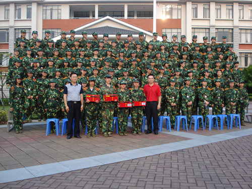 在董院长讲话结束之后,学院领导、2014级学子和班导们进行大合照,大家的笑容凝结在了这个温馨的时刻。在今日的慰问里,因为有领导老师们送来的温暖,2014级的学子们青涩的笑容里满载着感动。大合照过后,董院长和林书记为新生们送上清凉饮料,希望新生们可以圆满结束军训。
