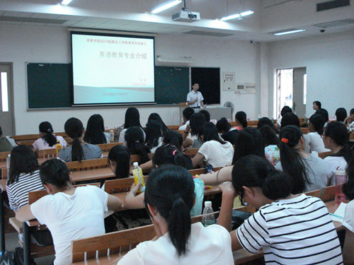 金秋送爽,丹桂飘香。2014年9月29日下午2:00,英语教育学院2014级新生开学典礼在教学楼E104隆重举行。此次学院开学典礼由党委书记林绍雄主持,英语教育学院院长董金伟、副院长肖建芳、副院长吴岩、系主任熊涛、辅导员迟殿凤和学院老师黄蔷也出席了本次开学典礼,在场的还有老生代表和2014级新生。