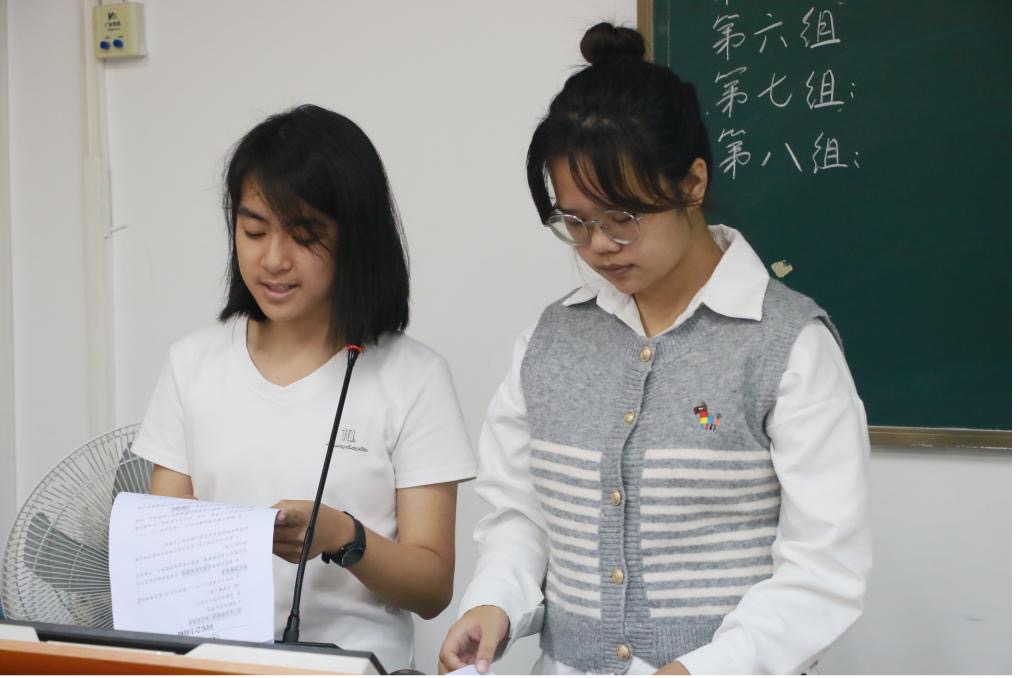 接下来,就是激动人心的游戏时间。八一十二一团学成员按会前的抽签分为八个小组进行游戏和积分比拼,积分前三名的小组可以获得奖励,积分最后一名的小组则要接受惩罚。三个游戏分别是emoji猜词、听歌识曲、抢椅子。emoji猜词考验了大家对四字词语的熟练程度,听歌识曲则让小组成员向大家展示了个人歌曲储备和描述能力,最为刺激的抢椅子游戏不仅考验了每组每轮派出的两位成员的反应速度,也调动了在场每位团学成员紧张的情绪。