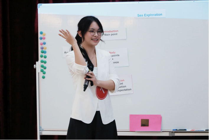 选手谭雯希以汉堡结构为喻,引出对文章结构分层的介绍。她通过小组讨论、互动问答等教学设计鼓励学生自主独立思考,教会学生通过寻找文章关键词、关键句来区分各类论据。同时,为了培养学生的辩证思维,她组织学生进行一个小型辩论来探讨“海洋是否应当被开发”的主题,并将习近平总书记的重要讲话精神融入课堂设计,分别阐明了进一步探索和开发海洋的利与弊。