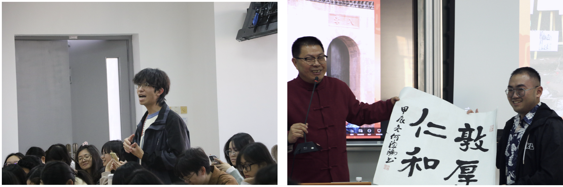 讲座过程中还不断穿插传统文化知识问答环节,学生们踊跃参与,获得了何穗鸿的字画奖品,现场氛围热烈。这不仅体现了学生们对传统文化的浓厚兴趣和热情,更彰显出传统文化在新时代青年心中的独特魅力与蓬勃生命力。