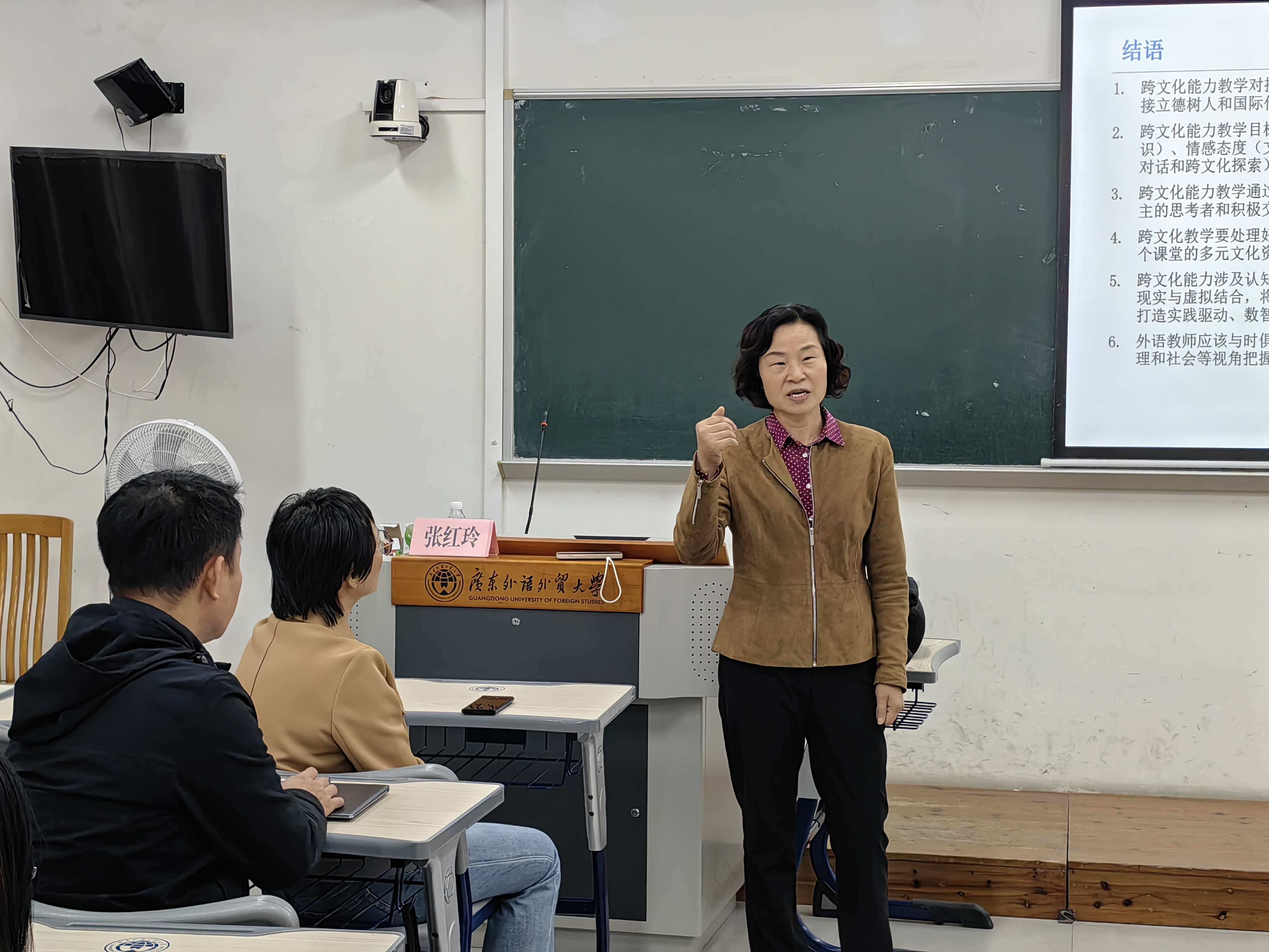 随后,张红玲教授结合跨文化教学案例,指明跨文化教学需要处理好中国文化与外国文化、课堂教学与课外实践之间的关系,要发挥每个课题的多元文化资源优势,营造跨文化分享、对话和反思的环境。张教授继续分享了跨文化能力大赛的育人价值与教学启示,表示高校外语教师应与时俱进,深入学习跨文化交际学科知识,增强跨文化教学能力,从认知、心理和社会等视角把握跨文化学习的本质规律。