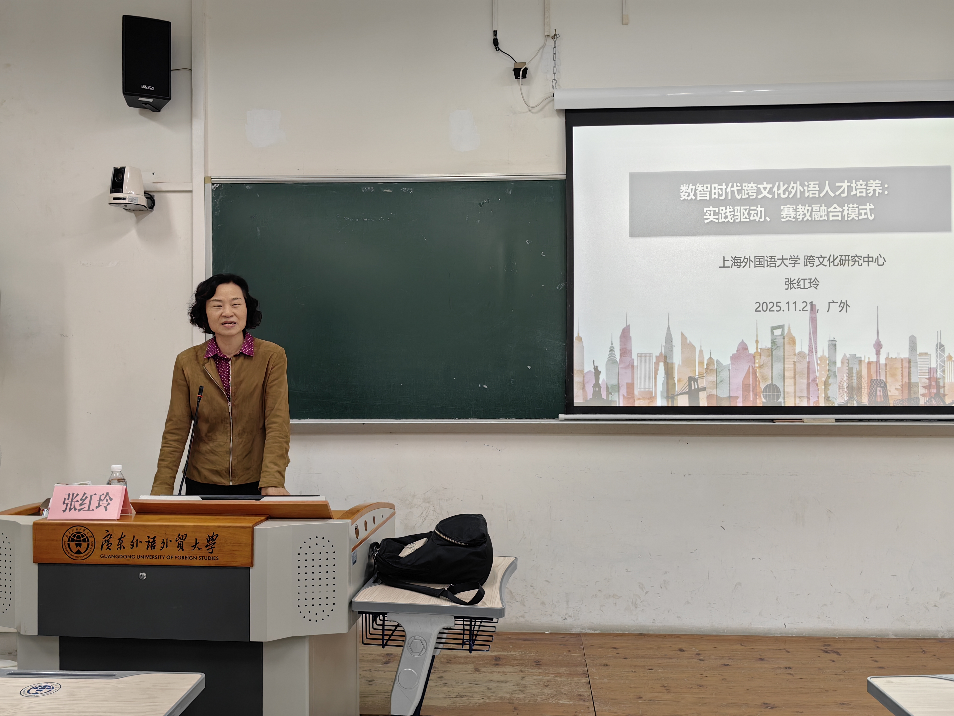 2025年11月21日上午9时30分,由广东外语外贸大学人力资源部(教师发展中心)主办、广东外语外贸大学英语教育学院承办的著名教授论坛第720讲在大学城校区教学楼F403顺利举行。本次讲座以“数智时代跨文化外语人才培养:实践驱动、赛教融合模式”为主题,由上海外国语大学跨文化研究中心主任、博士生导师张红玲教授主讲,广东外语外贸大学云山学者秦丽莉教授主持。