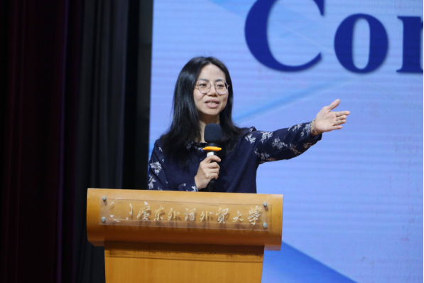 在精彩的教学展示后,严恺欣校友对比赛给予了高度评价和诚挚建议。严恺欣校友结合自身经验和观察,充分肯定了选手的英语语言表达和逻辑分析能力,对赛事的专业水准和教学状态给予了高度评价,同时,她提出了以新课标详尽的框架和理念为指引的建议,优化教学设计,强化对学生的引导,让教学成为更具意义的启发过程。