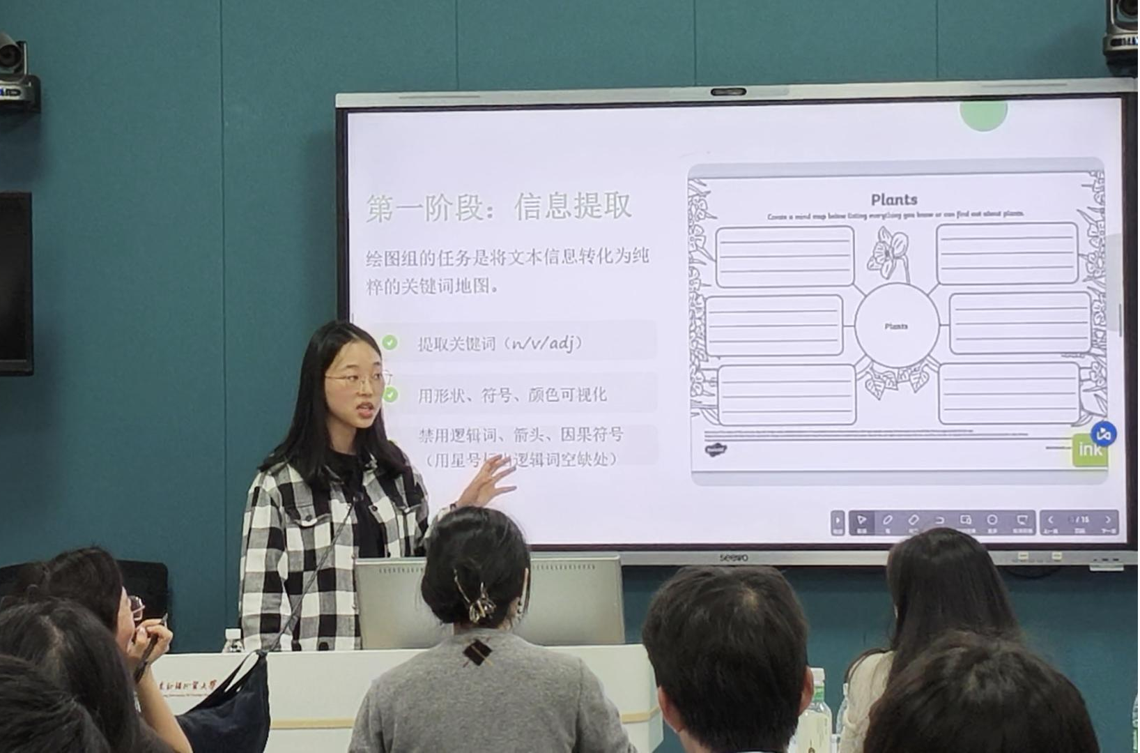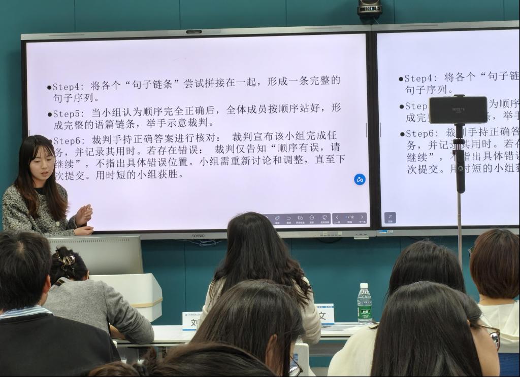 在实践环节,八组学生每组五人在指导老师的帮助下,合作设计了一个指向培养学生篇章逻辑理解能力的教学活动。经过一个半小时的热烈讨论与精心设计后,八个小组轮流派代表上台展示各自准备的教学活动: