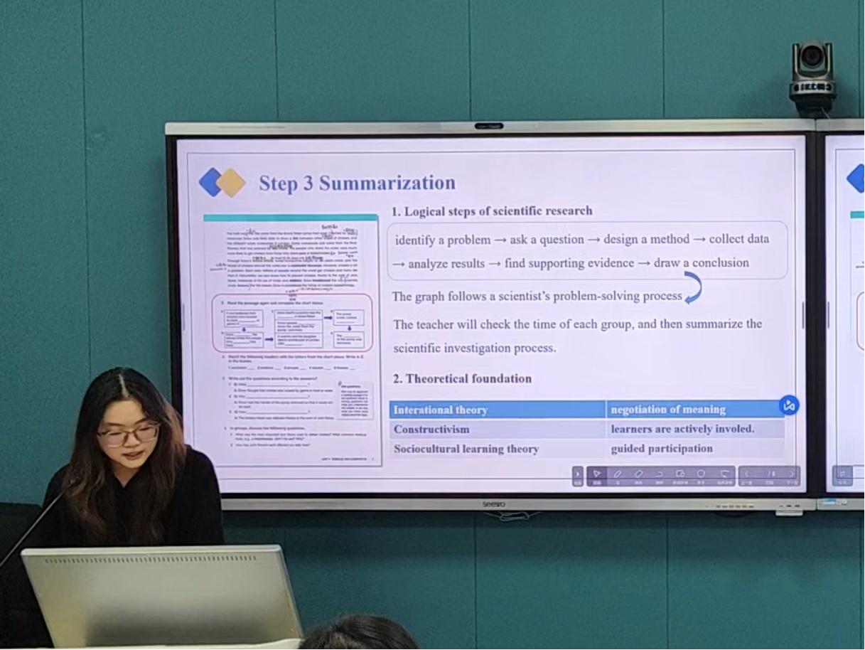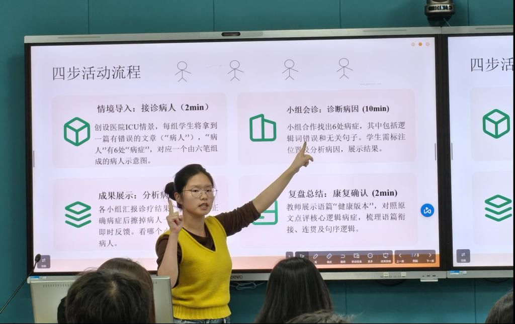 第四组带来的是名为“逻辑手术室”活动设计,以建构主义和任务教学法为理论基础,设置“医生诊断”沉浸式情景。活动预设时长20分钟,按照情境导入、小组会诊、汇报诊疗结果、教师反馈四个步骤展开。