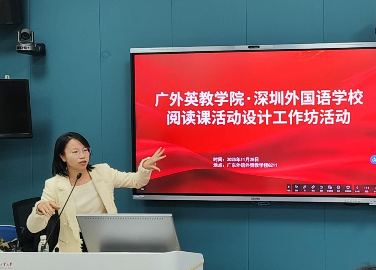 2025年11月28日,广东外语外贸大学英语教育学院与省级大学生社会实践教学基地深圳外国语学校合作,成功举办了阅读课互动设计工作坊。本次活动围绕培养和提升阅读素养之关注语篇逻辑,开展了一系列课堂设计实践活动。英语教育学院副院长李惠胤教授出席活动并致辞,向与会师生介绍了本次工作坊的目标与流程,并对深圳外国语学校教师的专业指导表示衷心感谢。