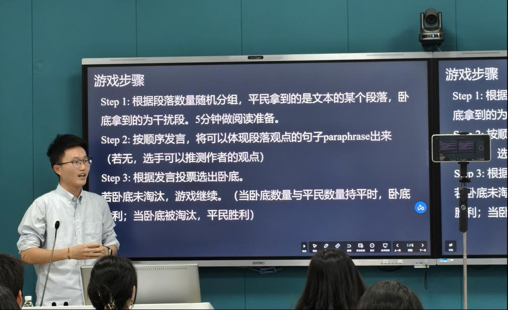 第二组设计了以“Who is the one”为名的阅读活动游戏,类似于“谁是卧底”的设计逻辑,旨在培养学生提取议论文主旨的能力和锻炼学生语篇逻辑和衔接理解能力。该组现场演示了如何开展此教学游戏,效果理想。