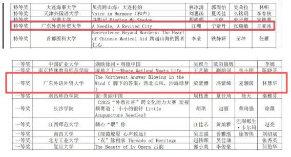 在“用外语讲好中国故事”与跨文化传播能力方面,学子们同样成绩亮眼。李乐妍、麦嘉慧同学(指导老师:林慧华、陈艾舒)的作品在2025年“高教社杯”大学生“用外语讲好中国故事”优秀短视频全国交流活动中荣获一等奖,创下我校在该赛事的历史最佳成绩。在第八届“外教社杯”全国高校学生跨文化能力大赛新增平行赛事——“讲述中国 传播中国”短视频大赛全国总决赛中,我院学子江珊、宁紫丹、张瑞敏组成的参赛团队(指导老师:王亚冰),凭借鲜明的文化立意、精湛的创作呈现与出色的跨文化表达,从全国2500余支参赛作品中脱颖而出,斩获中国学生本科院校组国赛特等奖,成为广东省获全国特等奖的四支队伍之一。我院学子冯紫烯、麦灏茵与会计学院学子梁紫珊组成的参赛团队(指导老师:林慧华)荣获中国学生本科院校组国赛一等奖。这充分展现了我院学子的卓越风采与学院人才培养的优异成果。