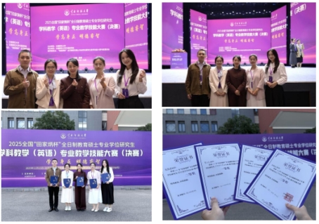 在研究生培养层面,学院同样捷报频传。在竞争激烈的2025年全国“田家炳杯”全日制教育硕士专业学位研究生学科教学(英语)专业教学技能大赛决赛中,我院学子在副院长李惠胤等老师的带队指导下取得全面胜利:曾泳泽荣获全国一等奖,郑婉仪、张茜婷荣获二等奖,杨婧怡荣获三等奖,体现了教育硕士培养的高质量与专业性。