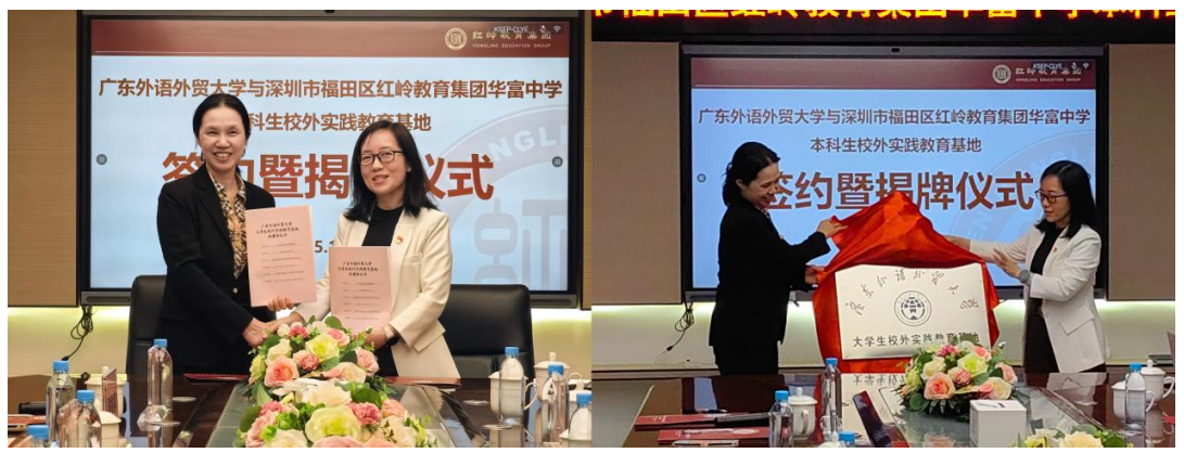 在与会人员的共同见证下,双方代表郑重签署《广东外语外贸大学本科生校外教育实践基地合作协议》,并举行“广东外语外贸大学大学生校外实践教育基地”的授牌仪式。未来,华富中学将成为广外学子锤炼教学能力、涵育教育情怀的重要实践场域。红岭教育集团华富中学相关领导则表示,学校将全力提供优质平台与资源,让实习生“来有所学、教有所获”。