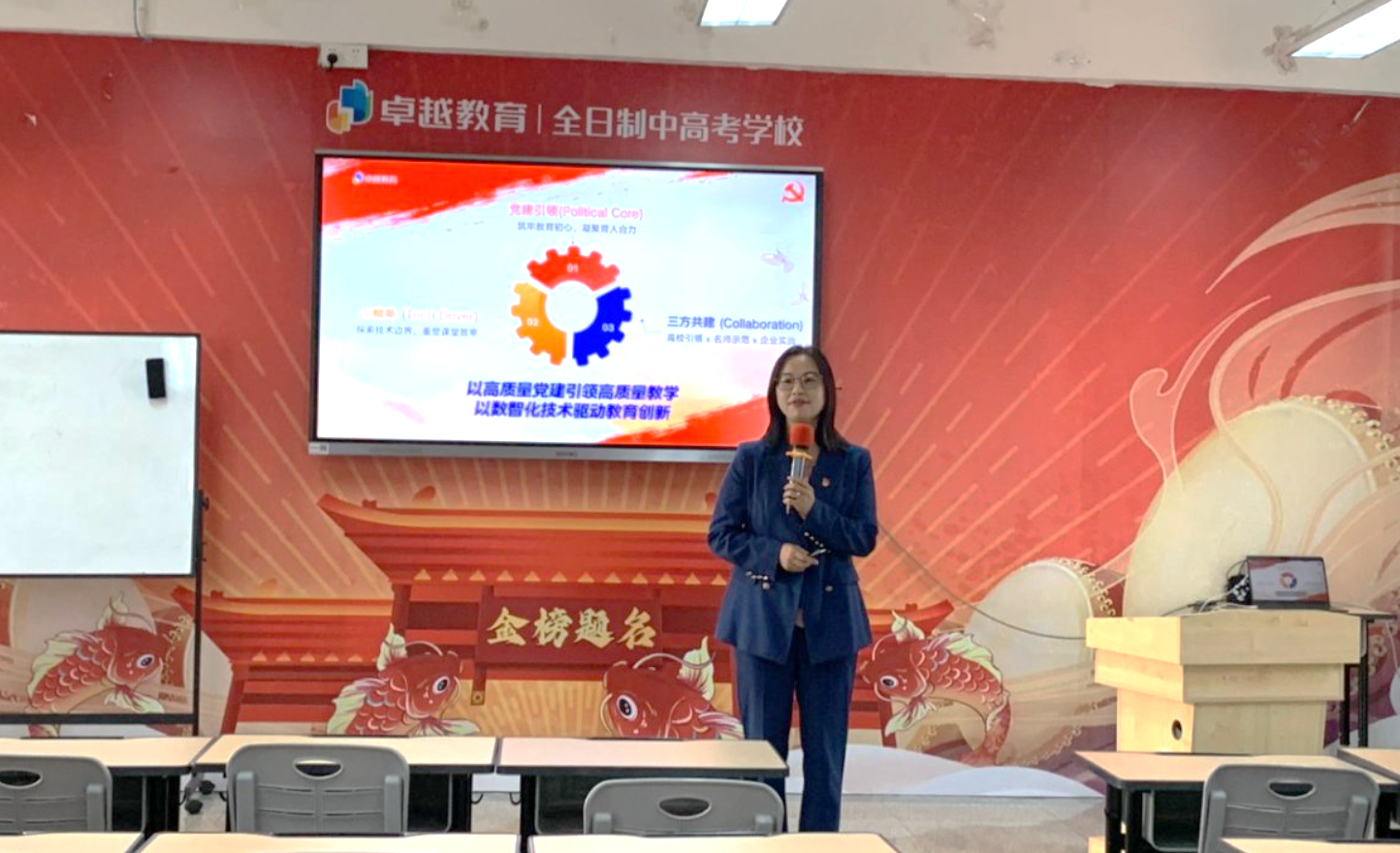 卓越教育集团副总裁兼全日制学校总校长黄小红率先发表欢迎致辞。她指出,党建引领如同为教育发展锚定了正确方向,而AI赋能则能让教育手段更为高效。卓越教育甘愿成为教育转型的探索者,借助数智化技术推动教育创新变革。