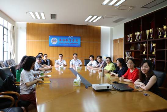 5月4日下午,学院在南校区院系楼245会议室召开新引进教师和青年教工座谈会,出席会议的有英语教育学院院长董金伟、副院长熊涛,党委委员和工会副主席齐湘燕,工会委员刘亮星及近几年引进或招聘的谢剑萍博士、韩艳梅博士、黄恩谋博士、李颖卉博士、曹丽红老师及办公室老师陈英、唐亚琪、温韵柔和周梦鸽,会议由学院工会主席、办公室主任曾国华主持。