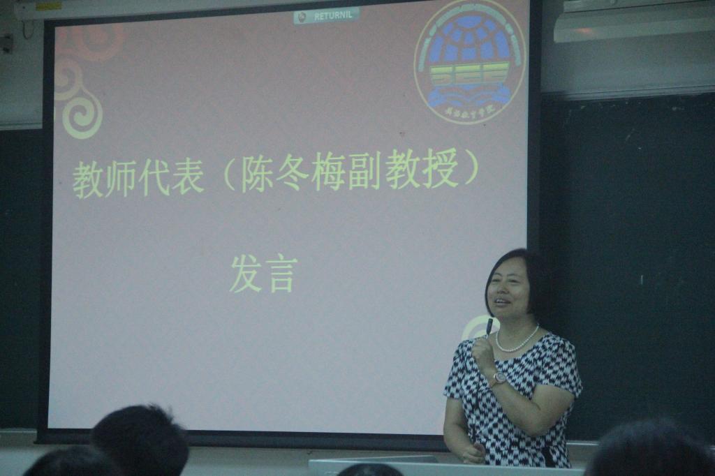 教师代表陈冬梅副教授讲到,在大学里,同学们要学会管理好自己,管理好时间,她为同学们推荐了《高效能人的七个习惯》和《manage yourself》这两本书籍。她还提到克林顿写的《My life》,鼓励同学们要树立目标,有短期的长期的和终期的,要有时间紧迫感,好好规划四年的大学生活。