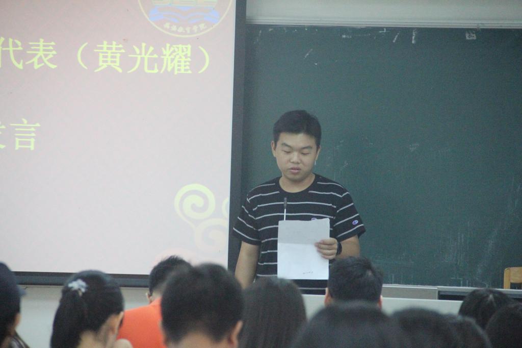 本科生新生代表黄光耀向大家讲述了他初“恋”广外的故事,对英语教育的喜欢,自己对广外是一所拥有“大学问”,“大视野”的学校的喜爱以及对“盈科而后进”脚踏实地、踏实基础的学习行动的理解。