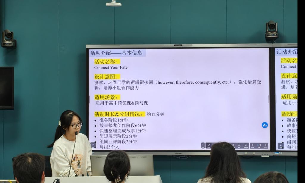 第一组展示了以“Connect your fate”为题的阅读活动游戏,设计意图是测试和巩固学生已学的逻辑衔接词,培养小组合作能力。活动适用于高中读说课和读写课,分为以下5个环节:准备阶段、故事接龙创作阶段、快速整理完成故事阶段、简短展示阶段和组间互评阶段。