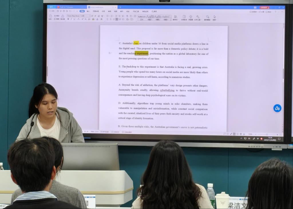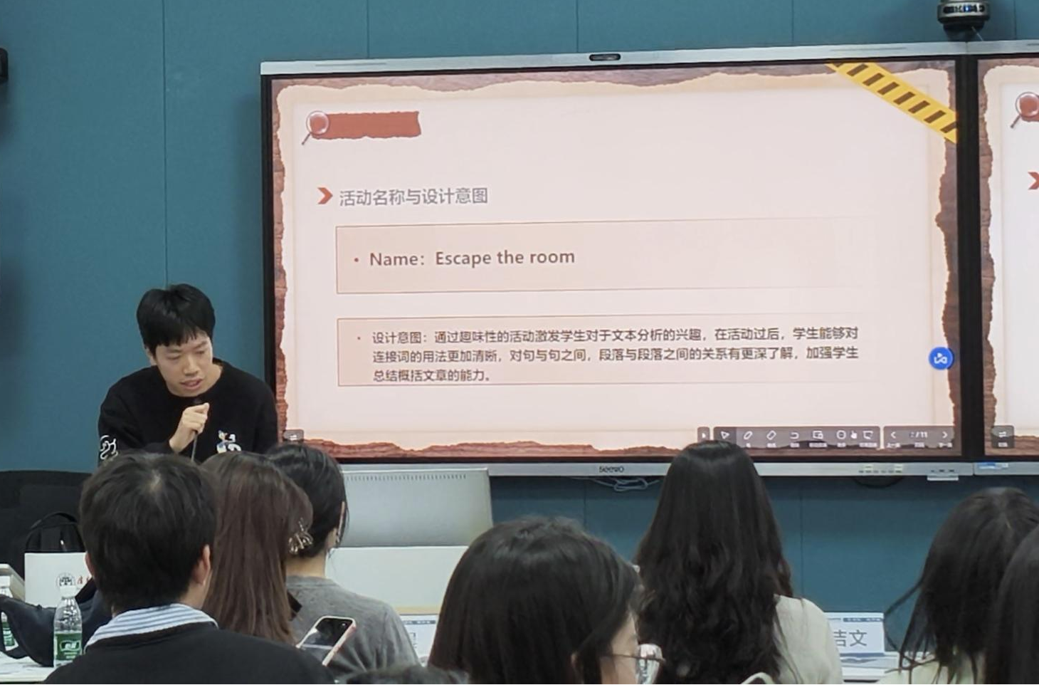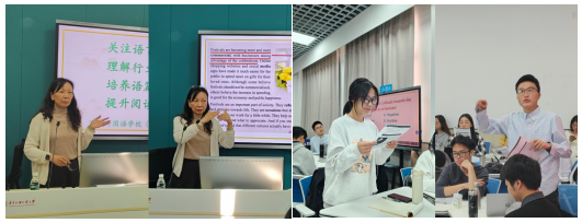 在实践环节,八组学生每组五人在指导老师的帮助下,合作设计了一个指向培养学生篇章逻辑理解能力的教学活动。经过一个半小时的热烈讨论与精心设计后,八个小组轮流派代表上台展示各自准备的教学活动: