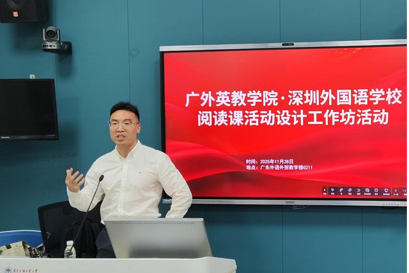 2025年11月28日,广东外语外贸大学英语教育学院与省级大学生社会实践教学基地深圳外国语学校合作,成功举办了阅读课互动设计工作坊。本次活动围绕培养和提升阅读素养之关注语篇逻辑,开展了一系列课堂设计实践活动。英语教育学院副院长李惠胤教授出席活动并致辞,向与会师生介绍了本次工作坊的目标与流程,并对深圳外国语学校教师的专业指导表示衷心感谢。