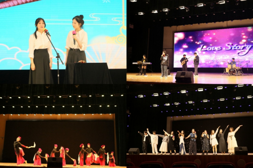 短暂的游戏过后,精彩的节目继续上演。英师2501班的相声节目《学电台》以风趣的语言、娴熟流畅的快板为观众带来欢声笑语。广外霏阳吉协通过深情演绎《Love Story》将观众带入了一段动人的音乐叙事,感染了全场观众。校舞队作品《溯·跃》通过刚柔并济的肢体语言与行云流水的队形变换,呈现出一场极具美感与力量的视觉盛宴。英教院歌队用温润深情的音色真挚演绎了《Dream in Tune》,为听众带来温暖而难忘的情感体验。