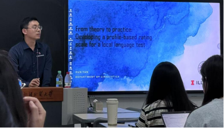 2025年7月1日下午,英语教育学院英语测评中心成功举办“关于本土化语言测试”的专题讲座。本次讲座由伊利诺伊大学香槟分校语言学闫逊教授主讲,聚焦“从理论到实践:本土化语言测试的基于个人档案评分标准的开发”(From theory to practice: Developing a profile-based rating scale for a local language test),旨在为语言教育工作者解析本土化测试的核心逻辑与实践路径。英语测评中心李雪莲、朱其韵、曹琳琳、李迪老师,学院张骏宇老师,以及学院研究生和本科生30余人参加讲座。