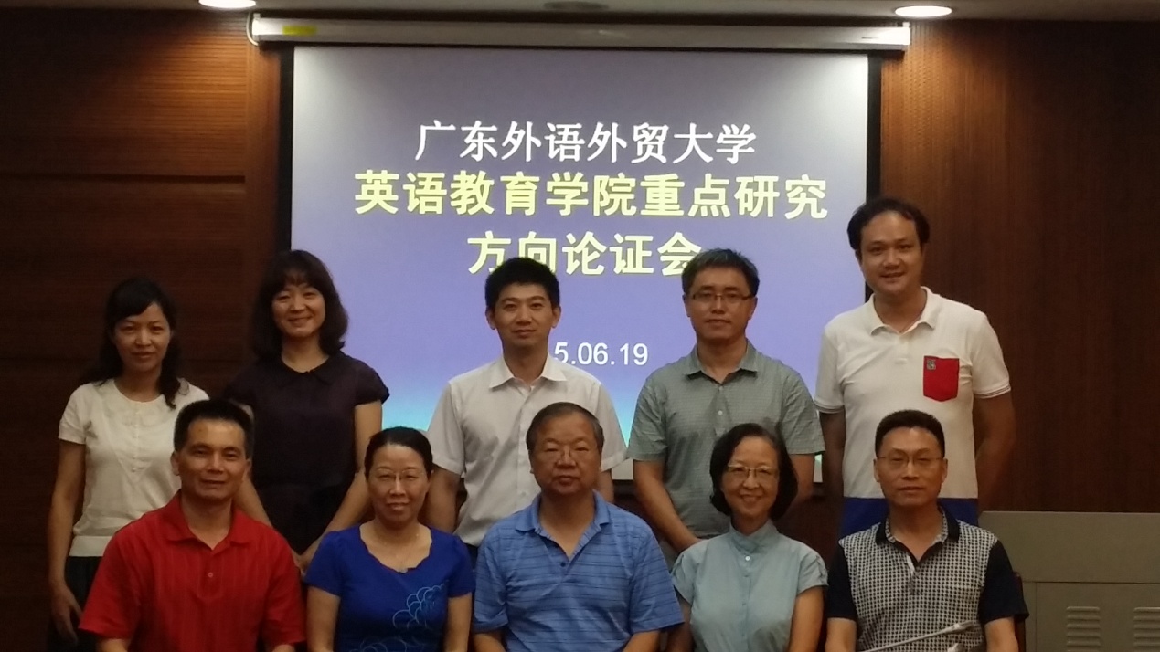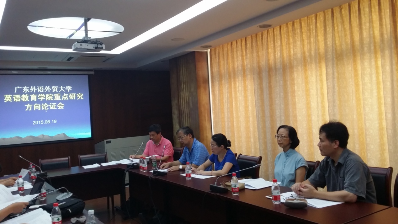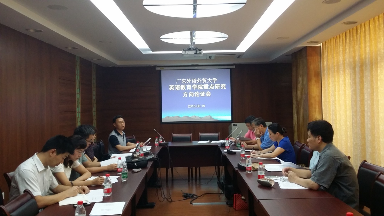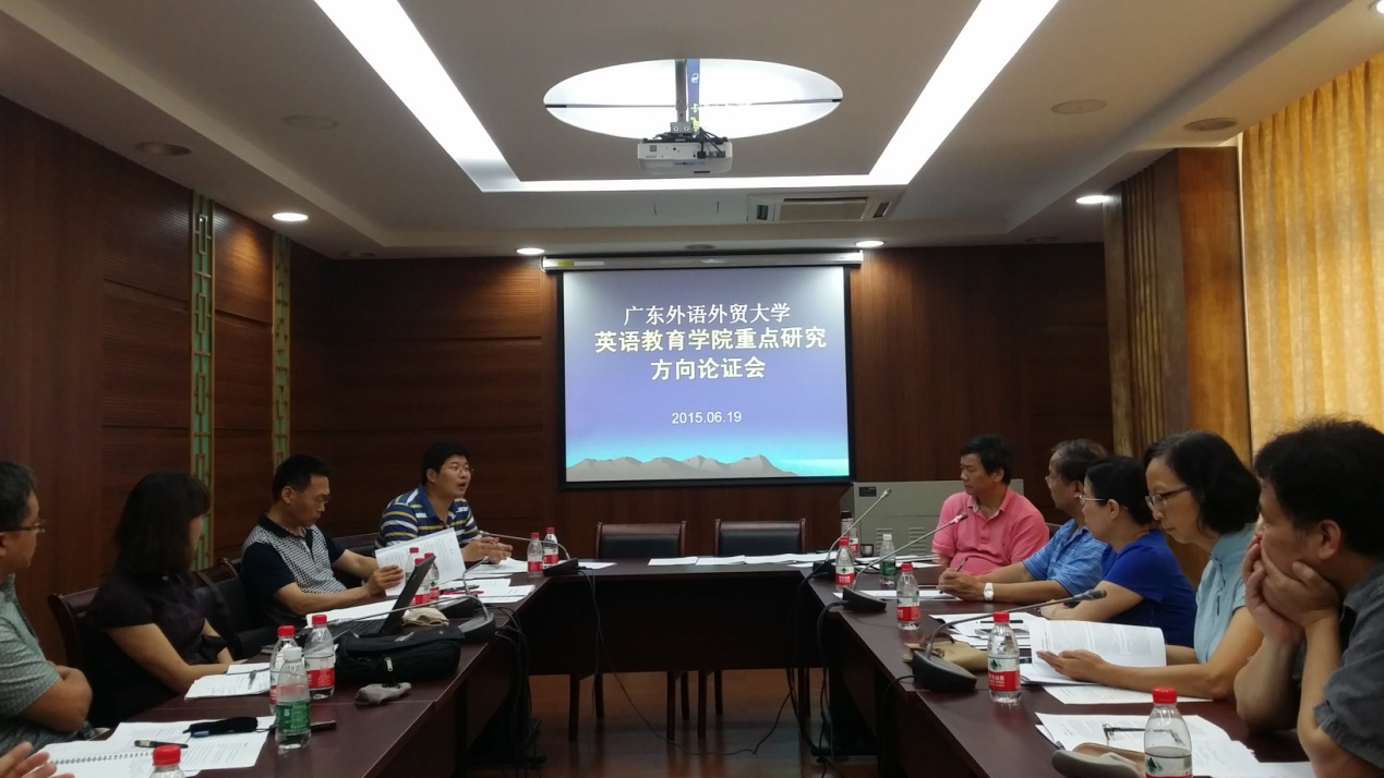 2015年6月19日上午在北校区八教307召开了广东外语外贸大学英语教育学院重点研究方向专家论证会议。校内外专家、校科研处领导、学院领导班子、研究中心主任、学院科研秘书等出席了本次会议。会议将对学院拟展开的四个重点研究方向进行专家论证,让各研究团队的带头老师与校内外专家一起思想碰撞,共同探讨几个研究方向的可行性,期待从校内外专家的评议中获得宝贵意见,避开错路、少走弯路,理清未来研究发展的方向和路径。