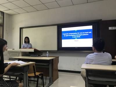 大会邀请了TESOL Quarterly 联合主编及美国密西根州立大学教授Peter De Costa 、英国华威大学教授Tony Liddicoat、加州州立大学圣伯纳迪诺分校教授陈融、中国社会语言学学会前会长及北京大学教授高一虹等著名学者作主旨发言。我院刘会英教授、李欣芳博士分别在机构语境中元语用语言研究和实验语用学这两个专题分会场作了题为 “语用学研究的文化哲学视角审视”、 “Pragmatic compensation for non-on-topic talk by right-hemisphere-damaged patients”的研究报告,并与其他参会学者进行了深入讨论和交流。下图为我院教师在分会场发言。