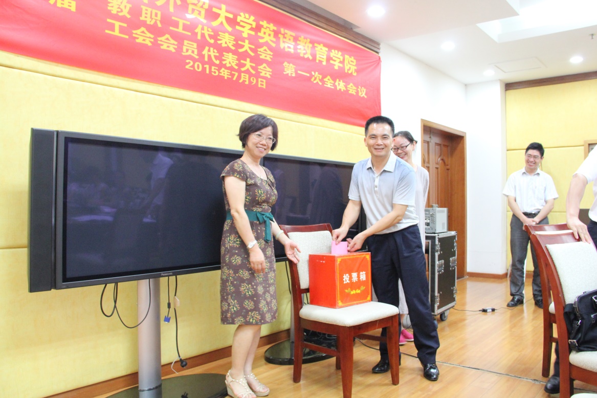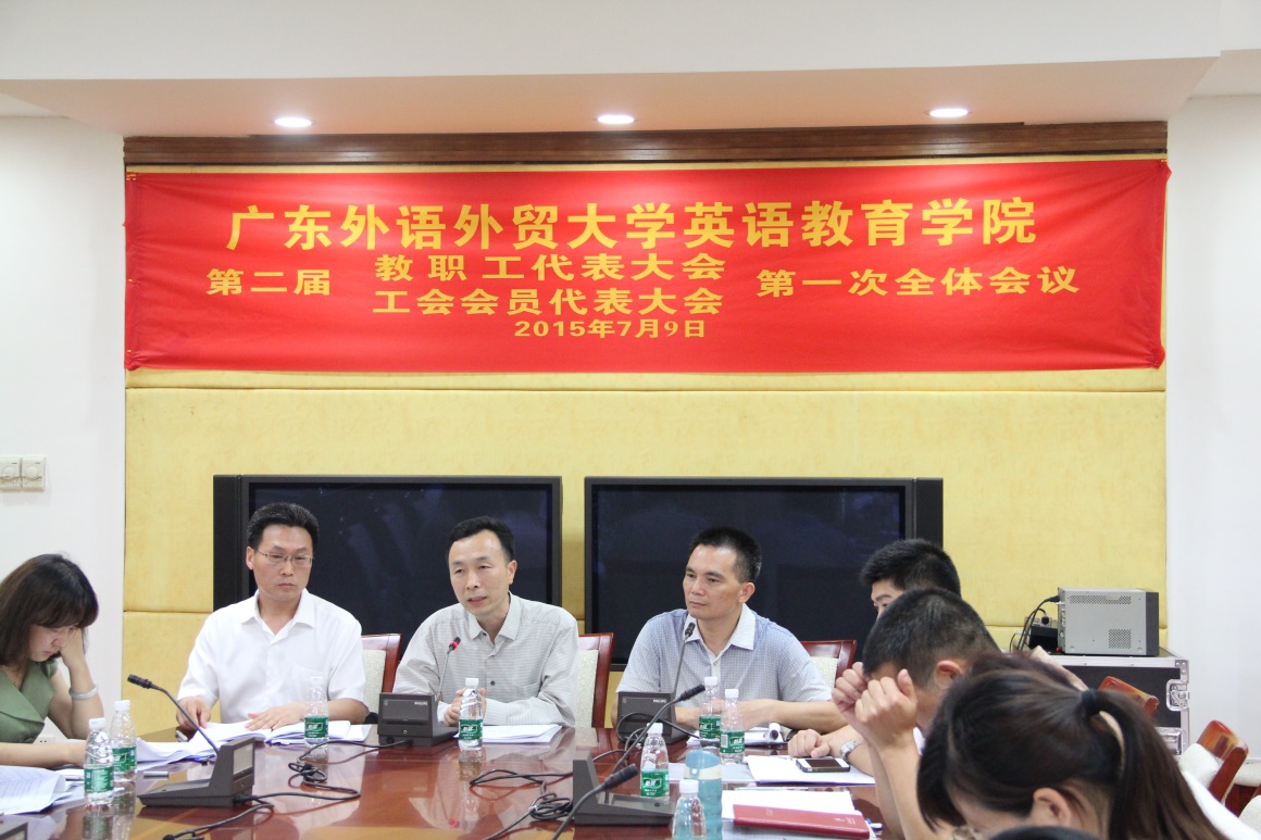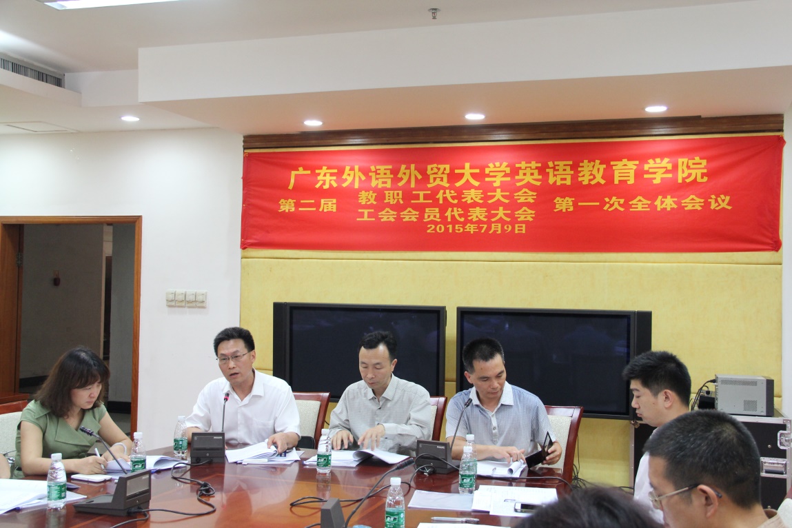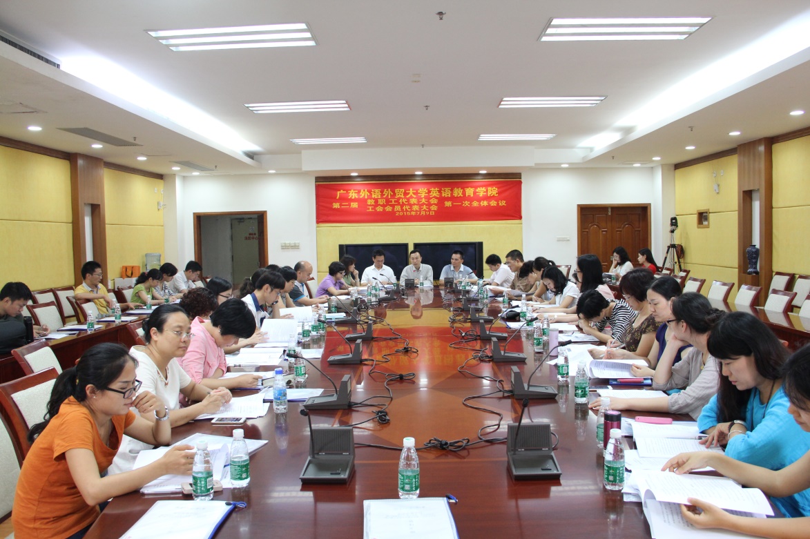 2015年7月9日下午,广东外语外贸大学英语教育学院第二届“双代会”(教职工代表大会、工会会员代表大会)第一次全体会议在南校区行政办公楼第一会议室举行。学校工会常务副主席金成良亲临指导,学院本届“双代会”正式代表和列席代表出席了会议。会议由学院党委书记林绍雄主持。