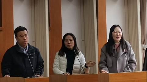 下午,刘亮星、高永新、杨小婉、谢娜和李崧五名骨干教师分别就专门用途英语教学改革在《营销英语》《管理英语》《财经英语》《金融英语》课程中的具体落实进行了专题发言。刘亮星副教授从课程大纲、教材选用、教法和期待四个方面详细介绍了《营销英语》课程如何安排和讲授,以及教材特点和教学方法,他建议新老师多观摩老教师的课堂教学,认真研读相关专业教材,跟老教师结成传帮带关系,了解、合作、克难、创新、进步、成功、卓越,并成为省级教学团队的一员。高永新老师向大家示范了《经贸英语》课程的规划、组织和安排,以《体验商务英语》为例,阐述了各个主题的重难点,包括具体教学过程中的主题拓展和课堂活动设计等。杨小婉副教授分享了《管理英语》课程的教学思路、课堂组织和活动安排等,指出二年级ESP单元选择标准包括话题相关、难度适中、技能全面、衔接性强、可操作性强。谢娜博士介绍了《财经英语》课程的教学对象、教学内容、教学内容、目的与要求以及课堂教学与课堂活动设计,讲解了每个单元的教学内容、时间分配、每次课的要点、重点和难点、教学过程和课堂小组讨论和任务设计等。李崧老师阐述了如何做好大二、大三《金融英语》课程的衔接,分析了学习者需求分析、教材选用的真实文本材料、教学大纲设计、教师的知识储备这四个特点的具体内涵,以及如何规划、安排和设计该课程。