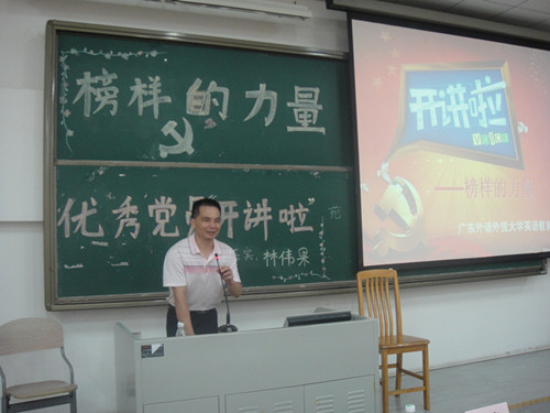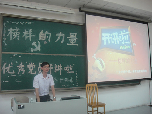 2014年9月12日10:00,英语教育学院党委在南校区教学楼C308举办了党建工作坊之榜样的力量——优秀党员“开讲啦”活动。开讲者为法学院2006届优秀校友林伟果,他与学院的部分同学分享了个人的成长历程、学习工作经历和体会以及人生发展感悟,通过现身说法使同学们受到启迪、得到教益。英语教育学院党委书记林绍雄、副书记何伟儒等领导以及教育系2011级、2012级的党员、入党积极分子和学生骨干等参加了活动。