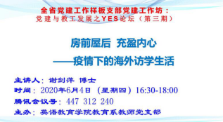 当疫情蔓延到世界各国时,抗击新冠病毒疫情成了各国面对的共同问题。教育系教师党支部有三位老师在海外工作和访学,疫情爆发以来,支部通过腾讯会议、微信等方式和他们沟通交流,他们对海外抗疫的分享和感受构建了战疫故事汇的特殊视角。周富强老师是佛得角孔子学院中方院长,疫情之下,佛得角孔子学院第一时间成立了疫情防控领导小组,并积极加强与驻佛使馆、中资机构、援佛医疗队等联系,加强防疫知识技能学习。周富强老师带领19位孔院员工坚守佛得角,在学生无法复课的情况下,做好线上教学,虽然有困难,但是一直在努力坚持。他说,他为祖国的发展和进步感到自豪和骄傲,决心坚守在佛得角这块小小的阵地上,克服困难,为国家争光。杨韶刚老师是埃及艾因夏姆斯大学孔子课堂的中方院长疫情期间,身处海外,他深深感受到中国对本国公民的关爱和帮助,在全球疫情爆发期间,中国驻埃及大使馆为在埃及的中国公民筹集提供包括口罩在内的防护用品,让在海外的中国公民可以第一时间做好个人防护。通过这次疫情期间发生的点点滴滴,他真切感受了到祖国的温暖和伟大,深深体会到中国政府在这次疫情中 “有责任、有担当”始终把人的生命安全放在第一位;感受到了祖国在医疗和科技等方面的先进水平,以及海外的中国人对祖国的无限信任。谢剑萍老师疫情期间在英国访学,她通过各种网络新闻媒体时刻关注着祖国的动态,英国的疫情虽然缓和,但是每天感染人数与国内相比,还是令人触目惊心。每当她看到这些数据,就更加感觉到祖国的强大和祖国人民的上下一心。她相信经历这次疫情后,每个中国人会为祖国感到骄傲,会更加爱国。