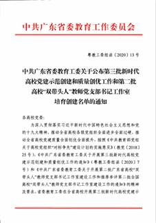 近日,中共广东省委教育工委公布了第三批全省党建工作示范高校、标杆院系、样板支部培育创建单位名单。继我院教育系教师党支部2019年获第二批“全省党建工作样板支部”培育创建单位后,我院基层党建工作又获佳绩:第二教学部党支部入选第三批“全省党建工作样板支部”培育创建单位。至此,我院已有2个“全省党建样板党支部”培育创建单位,入选数量位居全校首位。
