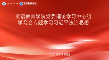 9月30日,广东外语外贸大学英语教育学院党委理论学习中心组专题学习了习近平法治思想。学院党委书记骆银花主持并领学。她强调,要深入学习贯彻习近平法治思想,全面落实党的二十届三中全会精神,更加注重系统观念、法治思维、强基导向,以改革创新精神推进法治建设,为全面建设社会主义现代化国家新征程提供坚强法治保障。