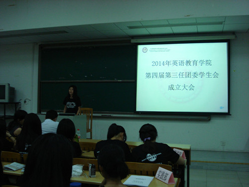2014年10月24日星期五晚上7:30,英语教育学院第四届第三任团委学生会成立大会在南校区教学楼C座208顺利召开。本次大会由团学副主席陈勉如主持,受邀出席此次大会的领导老师有英语教育学院党委副书记何伟儒和团委书记迟殿凤,同时英教团委学生会主席团以及各部门正副部长携本部门全体干事也出席了本次大会。