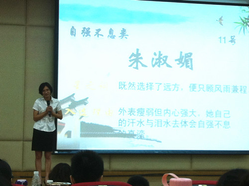 而此次答辩会上,也有一名来自我们英语教育学院的候选人。她是英教历年第一个入选“共青团之星”的学生。作为“自强不息”类的候选人之一,她自强自信,坚强乐观。她对自己说:“别人的优越条件是父母给的,我不羡慕他们。我要用自己的努力换取属于我的优越!”她在校身兼数职,对每一个职务都尽心尽力。作为英教自强社社长,她帮助那些跟她一样来自贫困家庭的同学;作为班长,她视同学如家人,提出以“家”的理念来经营班级,努力营造一个温馨的家;作为班主任,她待新生如自己的弟弟妹妹,给予他们关心和指导;作为志愿者,以“多做一些志愿者工作是我回报所有帮助我的人的一个重要途径”为理念,以志愿者工作为己任,竭尽所能去做志愿者工作,为别人带去更多的欢笑。她用汗水和泪水克服了困难,也收获了累累硕果。她连续两年获得校综合测评一等奖,被评为校“三好学生”,同时获得了国家励志奖学金、镇泰奖学金、福慧奖学金等多项殊荣。同时,她也是体育健将,在院运会中屡获佳绩,曾打破学院田赛的三项纪录;作为学校定向越野队成员,在2011年的广东省定向越野锦标赛中获得女单第五名。外表瘦弱但内心强大,她就是英语教育学院09级学生朱淑媚。