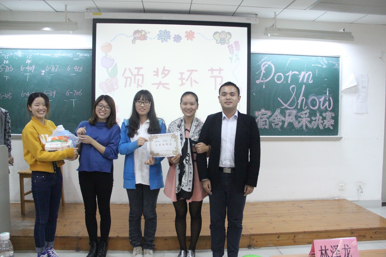 2015年11月1日晚上7点,由英语教育学院团学生活部主办的英语教育学院第五届宿舍风采大赛Dorm Show决赛在教学楼G206成功举办。出席现场的嘉宾为英语教育学院团委书记林泽龙老师,另外到场担任评委的有会计学院生活部部长杜林森、经贸学院生活部部长王林旋、商学院生活部副部长林文超以及思科信息学院生活部部长尹嘉敏。