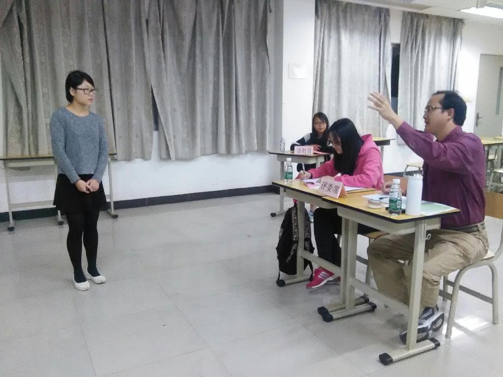 2014年11月19日晚上7:00,英语教育学院迎来了Micro-teaching师王争霸赛复赛。此次MT复赛于教学楼A301,A302,A303三个分场同时进行。由吕剑涛、梁利娟、孙红担任评委老师,由大四学子朱颖杰、杨艺、廖晓真担任学生评委。