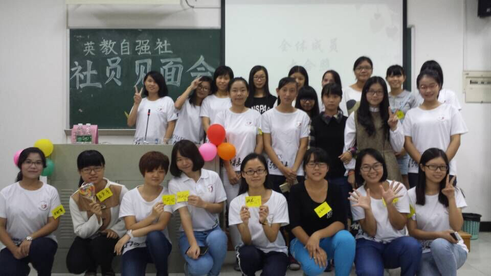 2015年11月15号的晚上19点,广东外语外贸大学英语教育学院在南教学楼A404举行了一年一度的社员见面会。莅临本次见面会的嘉宾有英语教育学院团委书记林泽龙,英教自强社指导老师迟殿凤,新长城广外自强社社长黎荣霞,新长城广外自强社副社长周绮,新长城广外自强社副社长陈伟颖,新长城广外自强社社员部部长张淑颖以及英教自强社社长王丽玲。