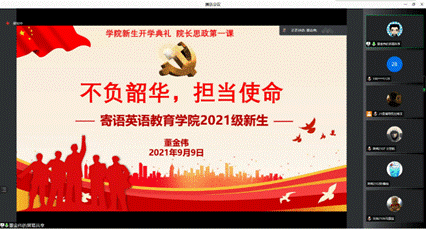 2021年9月9日晚,英语教育学院2021级新生开学典礼暨院长思政第一课于腾讯会议线上举行。英语教育学院院长董金伟,院党委书记杨敏生,副院长吴岩、张倩、陈金诗,党委副书记骆银花,党委委员江健,院长助理李惠胤,团委书记刘博洋,辅导员迟殿凤,师范系主任谢剑萍以及2021级全体新生参加了开学典礼。此次典礼由骆银花副书记主持。