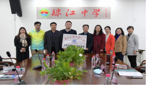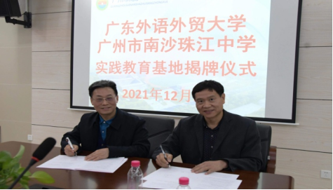 2021年12月30日下午,我院院长董金伟、副院长吴岩、党委副书记骆银花、师范系主任谢剑萍和教育系教师党支部书记张丽冰一行赴广州市南沙珠江中学,举行“大学生校外实践教育基地”签约及授牌仪式。珠江中学校长常志清、副校长黎继承、曾文明等参加了此次活动,南沙区教育局党组成员黄汐莅临指导并见证了实习基地签署仪式。
