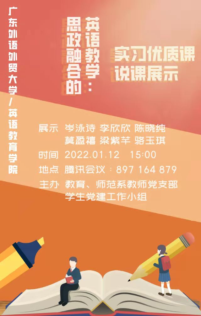 为积极发挥党建引领作用,实现党建与业务发展“双融双促”,在教育系、师范系结束教育实习之际,2022年1月12日下午,英语教育学院教育系教师党支部联合学院学生工作小组,通过腾讯会议开展了以“思政融合的英语教学”为主题的实习优质课说课展示活动。本次活动由教育系教师党支部书记张丽冰主持,岑泳诗、李欣欣、陈晓纯、莫盈禧、梁紫芊、骆玉琪六位2018级同学分别进行了实习说课展示分享,副教授吕琳琼做了点评,近三百名师生踊跃参加活动。