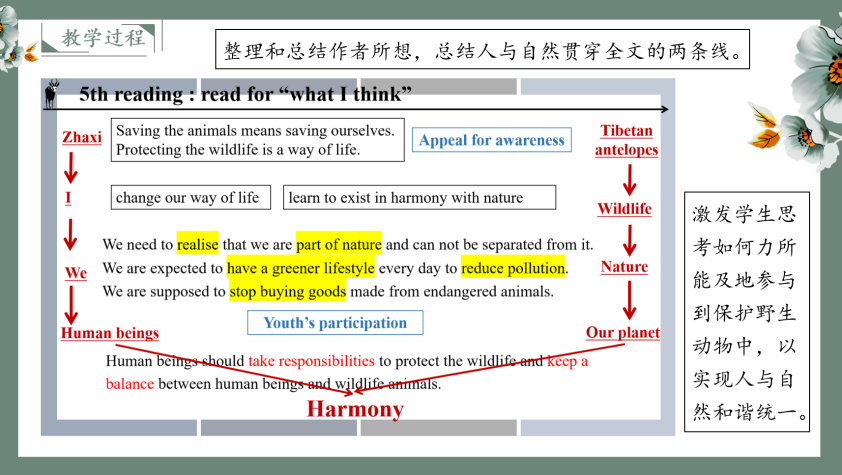 莫盈禧分享的说课结合疫情时代背景,引导学生树立正确的生命观、学会正确看待生死,充分渗透批判性思维教育和生命教育。梁紫芊以时下热门的动漫人物玲娜贝儿参观上海为主线,带领学生了解上海的民俗风情、地域文化,渗透美育提升学生认识美、理解美、欣赏美、创作美的能力。骆玉琪的说课通过五次阅读任务,层层递进,解读阅读本文的“所见所闻所想”,促进高一学生的深度思考,激发学生对于保护环境、保护野生动植物的热情。
