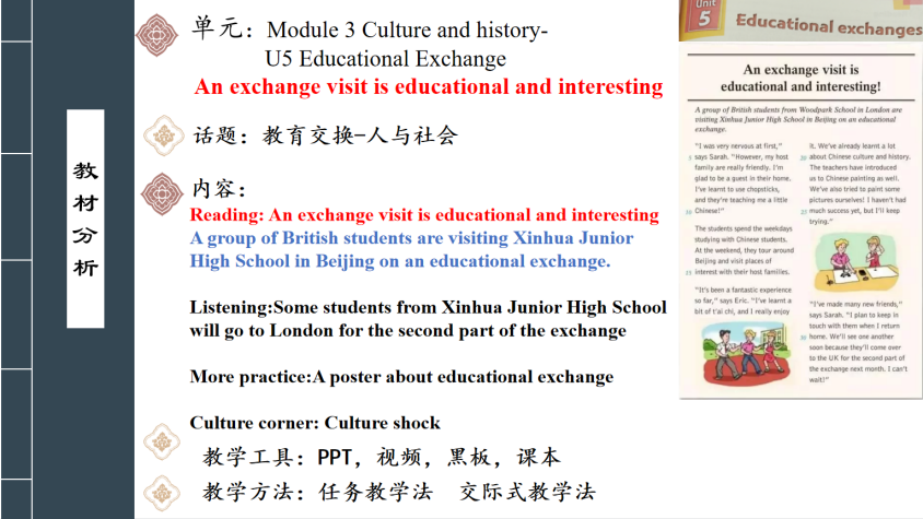 岑泳诗以“提升民族自豪感,讲好中国故事”为题进行分享,向大家展示如何将中国传统文化、现代中国成就等思政内容融入到中学英语阅读课堂教学当中。李欣欣以“弘扬中国传统文化,推动中国文化‘走出去’”为题,分享了一节介绍“中国红”的八年级英语写作课。陈晓纯分享的说课主题为“中外文化交融,增强民族自豪感”,她结合时政、串联古今,将学生自身的教育交换经历与思政内容紧密结合,以培塑学生自我认识和人类命运共同体意识。