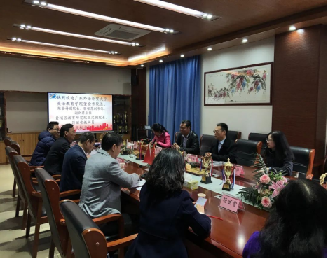 新港中学彭晓珲校长介绍了新港中学的发展历程、教育教学特色以及“阅动心港、幸福成长”的校园文化。新港中学由广州港集团始建于1993年,2014年学校整体搬迁至黄埔区南岗亨元校区,地理位置优越、交通便利。董金伟院长对新港中学的校园文化建设表示了肯定,同时从实习、组织架构、学生就业和师资培训几个方面介绍了我院特色。黄埔区教研院王定铜院长介绍了黄埔区整体师资情况,表达了与我院进一步拓展合作关系的殷切期望。