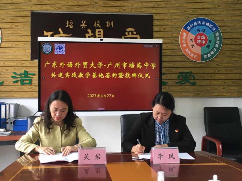 2023年4月27日上午10点,广东外语外贸大学英语教育学院与培英中学校外大学生实践基地暨优质生源基地签约仪式在培英中学鹤洞校区举行。