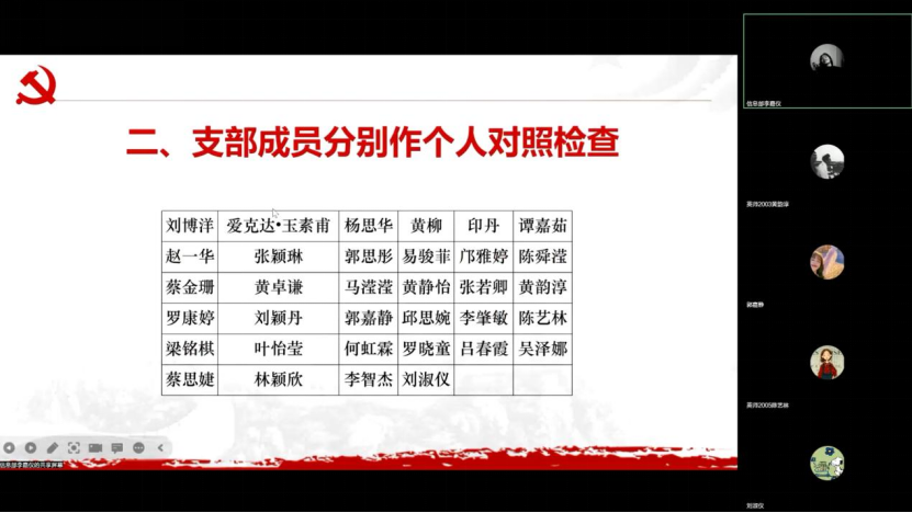 9月13日晚上,英语教育学院师范系学生党支部在线上举行主题教育专题组织生活会和民主评议会。师范系学生党支部书记刘博洋、师范系学生党支部全体党员参与本次会议。
