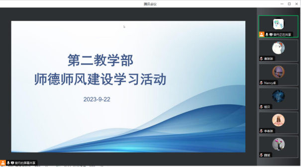 9月21日下午,英语教育学院第二教学部举行师德师风建设学习活动,会议由系部主任曾丹主持,全体教师线上参会。