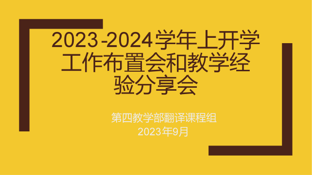 9月1日中午,第四教学部翻译课程组召开2023-2024上半学年工作布置会暨教学经验分享会。受台风天气影响,本次会议线上召开,课程组组长徐翠华主持,翻译组全体教师共11人参加。会议内容主要包括课程说明与考核方式讨论、笔译教材编写和雨课堂使用经验分享。